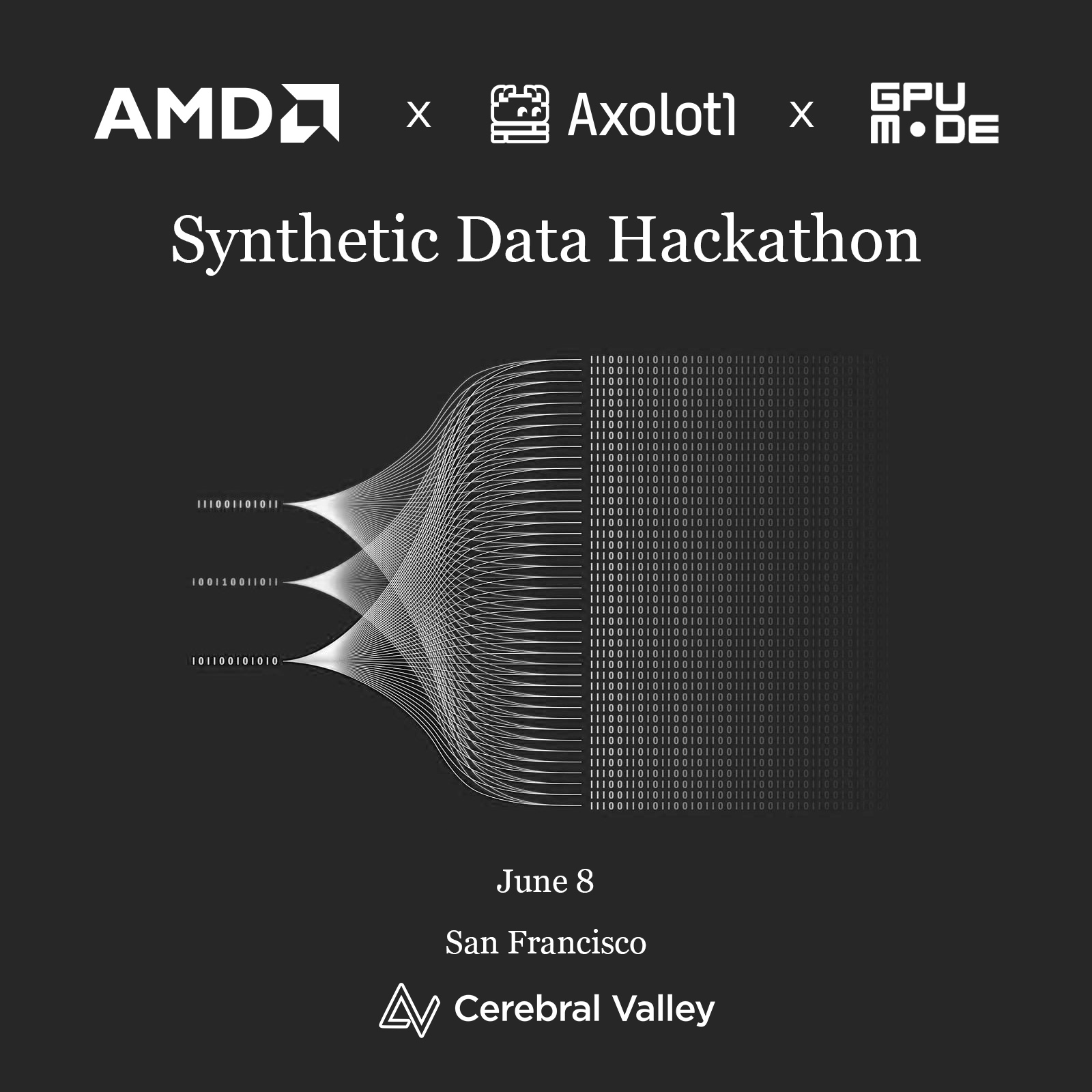 Welcome to the AMD x Axolotl x GPU Mode - Synthetic Data Hackathon hosted in collaboration with Cerebral Valley and Shack15.